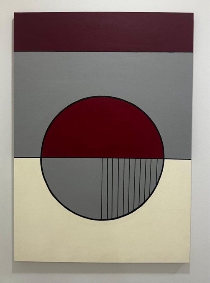 Kırmızı ve gri tonlarda, dairesel ve çizgisel detaylara sahip soyut geometrik tablo.