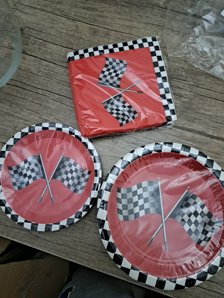 Kırmızı tabak, peçete ve üzerinde çapraz yarış bayrakları ve kareli bordürlerle yarış temalı parti seti.