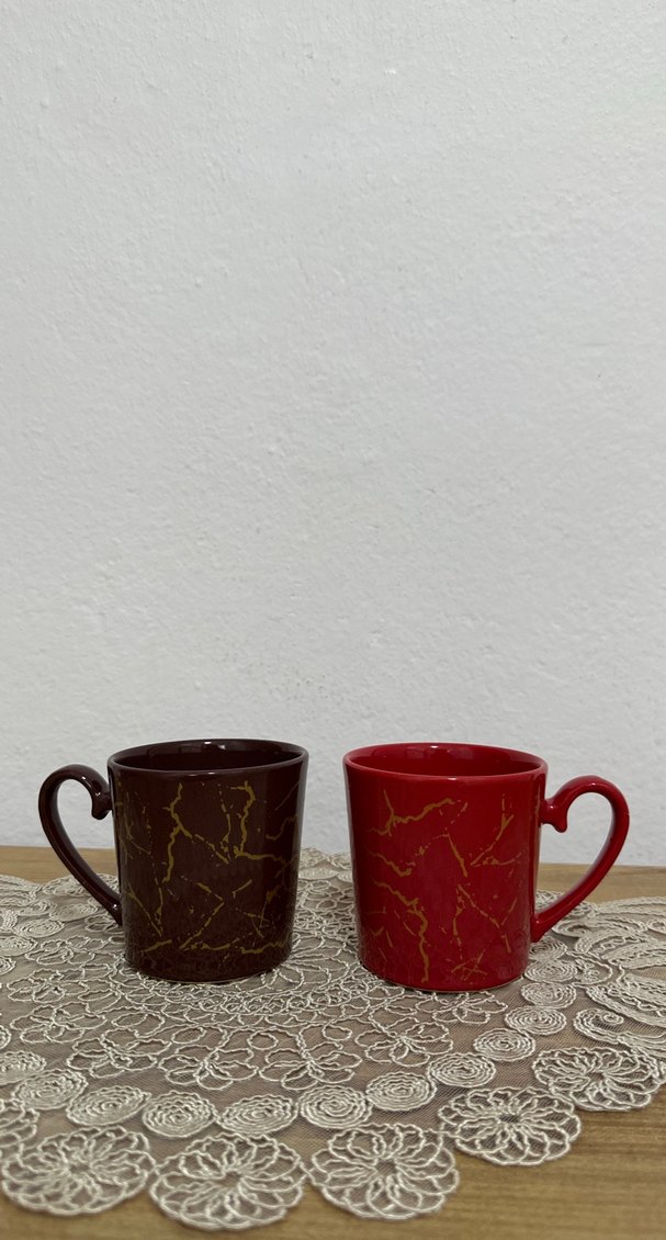 Kırmızı ve kahverengi mermer desenli, renkli ve şık iki adet kupa seti. ☕