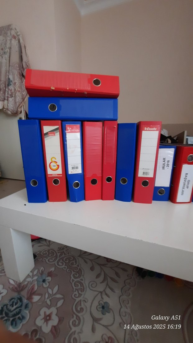 Kırmızı ve mavi renklerde, belge ve notları düzenlemek için kullanılan halka dosya seti. Ofis veya ders çalışmak için dayanıklı ve kullanışlıdır. 15 adet adetfiyati 90 tl kücük 3 adet 100 tl adeti