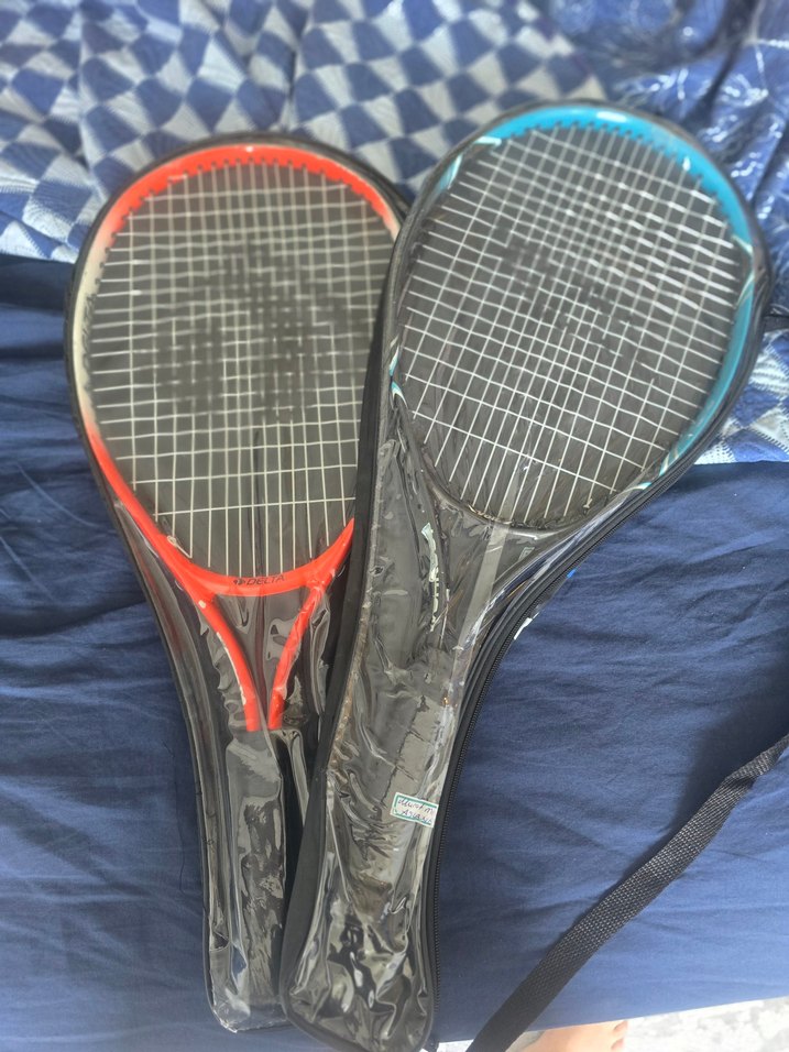 Kırmızı ve mavi renkli, koyu çerçeveli iki tenis raketi seti, koruyucu plastikle kaplıdır.