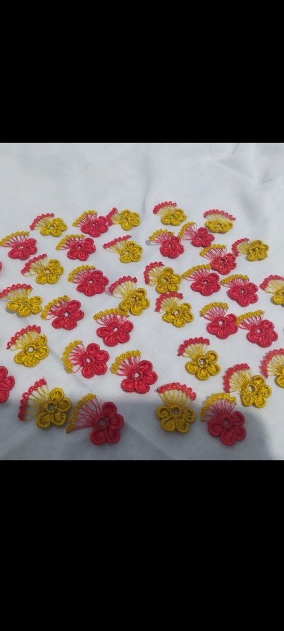 Kumaş süslemeye uygun, kırmızı ve sarı renklerde ince iplik işi el yapımı çiçek motifler.