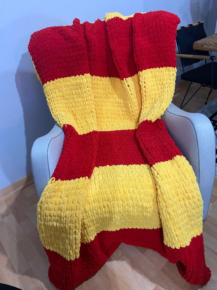 Kalın, yumuşak kadife kumaştan yapılmış kırmızı ve sarı geniş çizgili battaniye, sıcaklık ve konfor sunar. ️