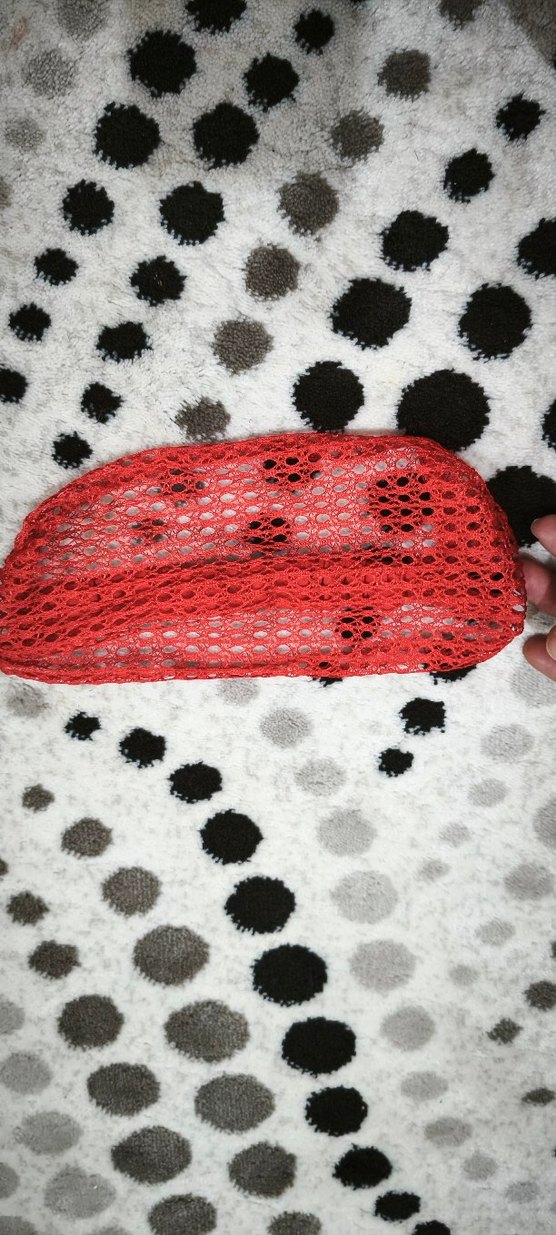 Kırmızı renkli, yılan desenli ve nefes alan file yapısına sahip sahip saç bandanası