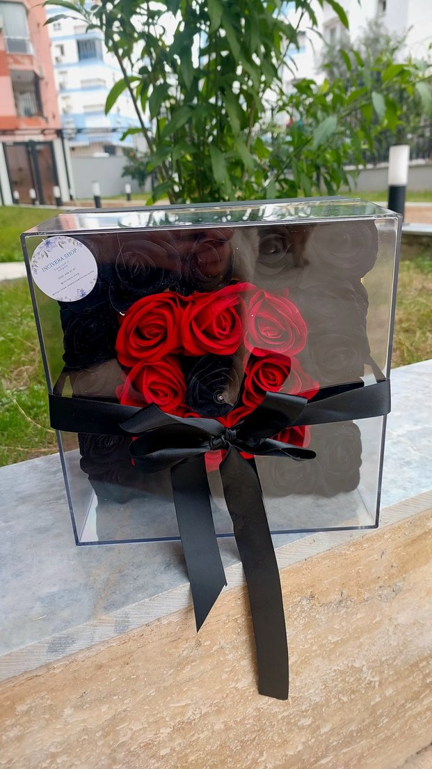 Siyah ve kırmızı güller siyah kurdele ile düzenlenmiş, şeffaf kutuda hediye olarak sunuluyor.