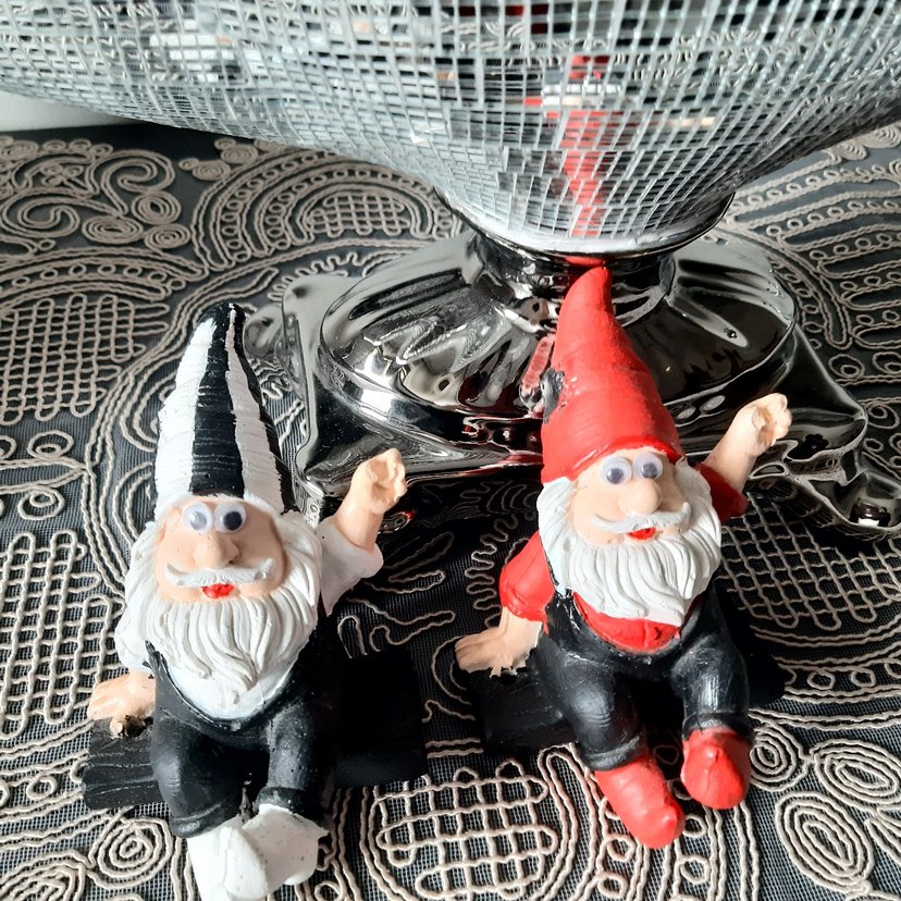 Kırmızı ve siyah şapkalı, beyaz sakallı bahçe cüceleri, desenli zeminde yer alıyor. ♂️