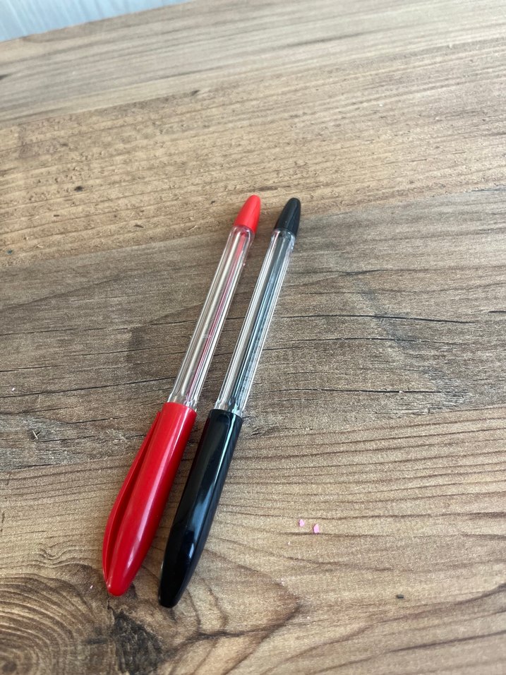 Kırmızı ve siyah renklerde, şeffaf gövdeli iki tükenmez kalem seti. ️