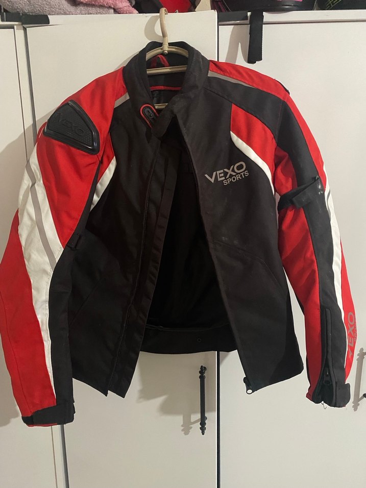 Kırmızı ve siyah renkte, Vexo logosu bulunan, sentetik kumaştan yapılmış, uzun kollu ve cırt cırtlı biker tarzı kadın ceketi. Rahat ve şık bir dış mekan görünümü sunar.