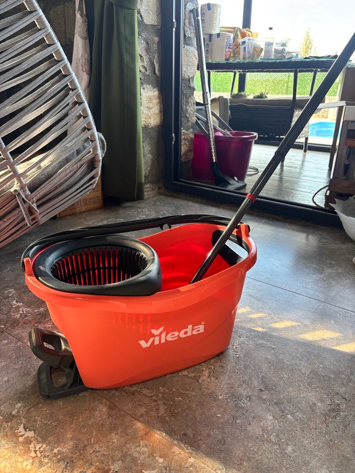 Koyu kırmızı renkte Vileda temizlik kovası, yerleşik sıkma aparatı ve tekerleklerle kolay taşınabilirliği sağlar.