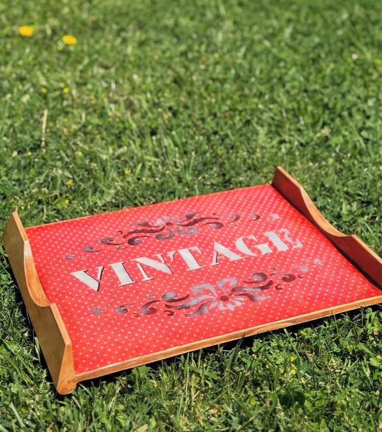 Renkli kırmızı ahşap tepsi, vintage desenler ve "VINTAGE" yazısı ile süslenmiştir. Çift taraflı kullanılabilir.kazıma eskitme yapılıp transferler ile süslenmiştir stencil donunuşlarla özelleştirilip 3 kat vernik sürülmüştür