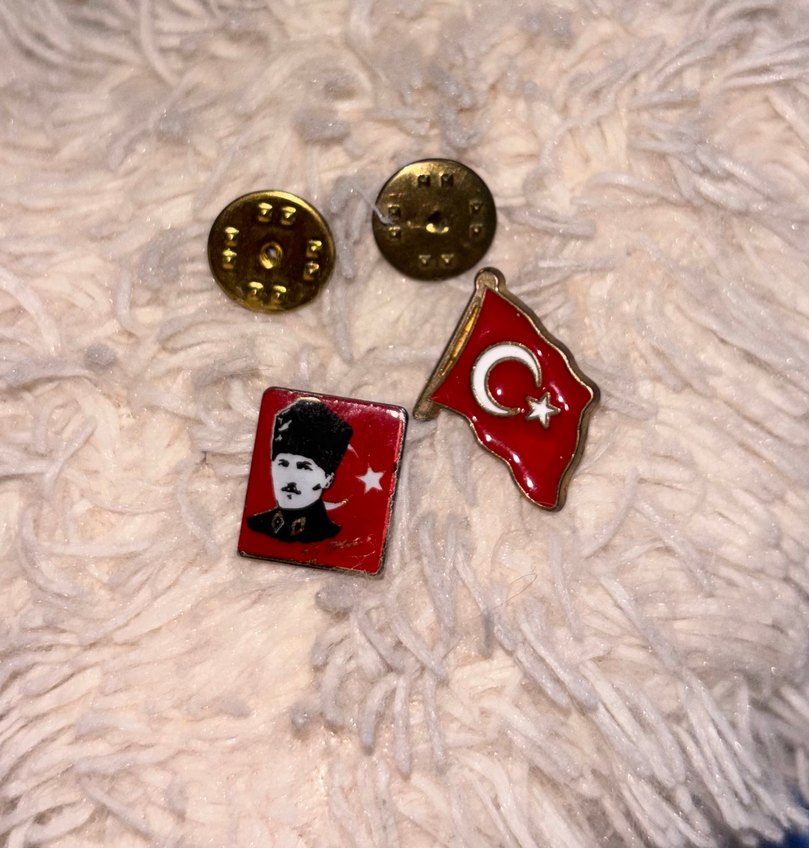 Koyu kırmızı tonlarında, metal arkalı, vintage tarzda Atatürk ve Türk bayrağı rozetleri. Modest bir counterculture havası taşıyor.