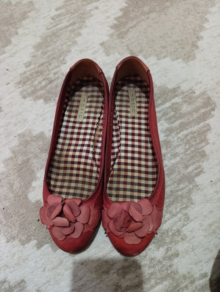 Kırmızı vintage tarzı, dolgu topuklu ve tokalı kadın babet. Kauçuk malzemeden, çiçek detaylı ve kareli iç astarlı, günlük rahat kullanım için uygun. pazarlık yapılır
