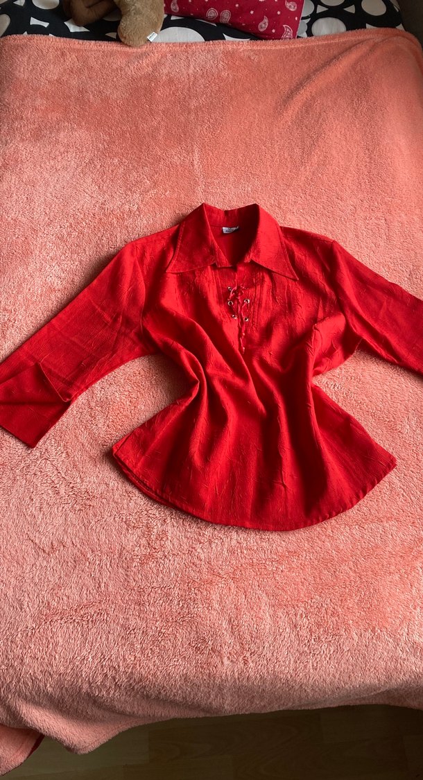 Düğmeli ön ve yakalı, parlak kırmızı keten kumaştan kadın gömleği. Uzun kollu, bol kesim ve midi boyda, bohem tarzını yansıtır. Günlük kullanım için uygundur. Omuz genişliği:39, omuzdan boy:59, koltuk arası:48, kol boyu:40. Hiçbir kusuru deformesi yoktur, yazlık kumaş s-m uyumlu