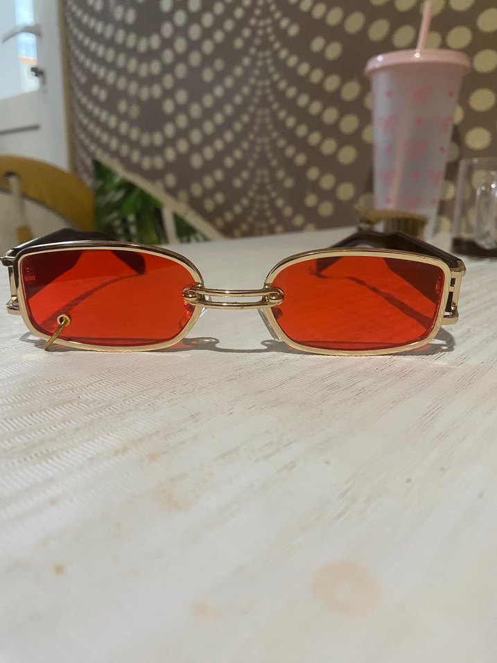 Kırmızı dikdörtgen vintage güneş gözlüğü, tokalı detaylı, renkli lenslerle bohem ve retro tarz sunar. ️
