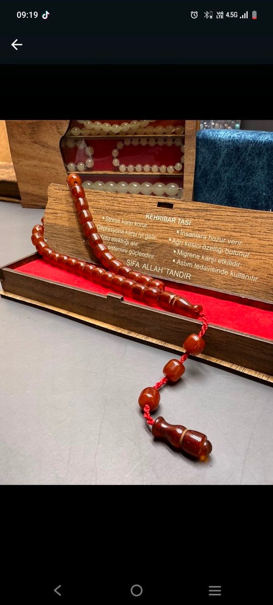 Renkli kırmızı vintage tarzda kehribar tesbih. Stres, depresyon ve migrene karşı destek sağlar. Ahşap kutusunda, faydaları kazınmış şekilde gelir.