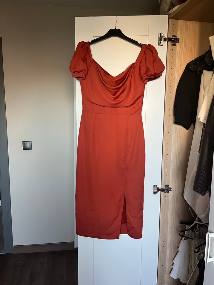 Kırmızı parlak kumaştan, kısa kollu ve drapeli kayık yaka, vintage tarzda fit kesim midi elbise. Romantik gece için cesur bir seçim.