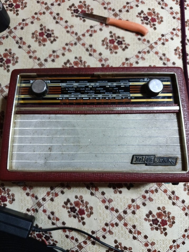 Koyu kırmızı renkli, iki kontrol düğmeli ve klasik ayarlı vintage müzik sistemidir. Nostaljik bir müzik deneyimi sunar. calismiyo dekorluk