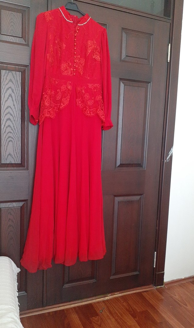 Koyu kırmızı vintage uzun elbise, uzun kollu ve yüksek yakalı, bol kesim ve drapeli tasarıma sahiptir. Düğün için uygundur ve klasik zarafet sunar.