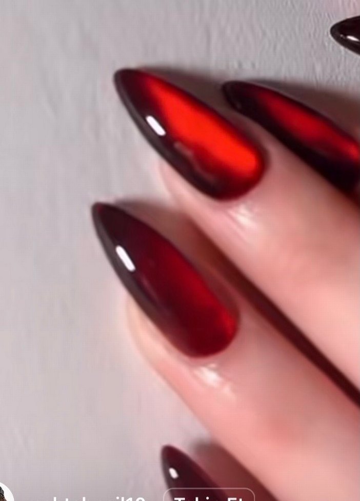 Parlak görünümlü koyu kırmızı tırnak süslemeleri, dikkat çekici bir görünüm sağlar.