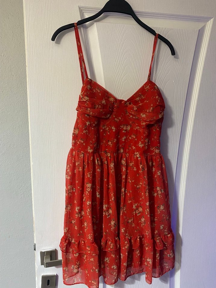 Kırmızı renkli, askılı ve bol kesim mini elbise. Parlak sentetik kumaş, volan detayları ve bohem tie-dye deseni ile romantik akşamlar için uygun. ( defosu hafif sökük giyilmeye engel değil zaten belli değil )
