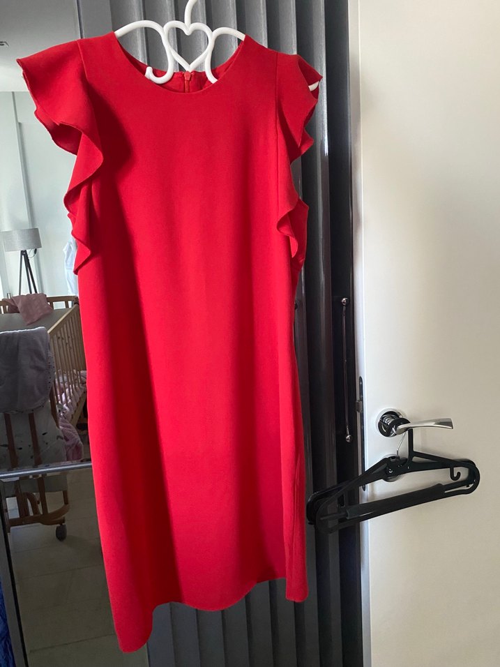 Kırmızı renkli, V yakalı, volan detaylı ve kolsuz elbise. Rahat kesimiyle romantik akşamlar için uygun, renkli ve desen içermeyen tasarım.