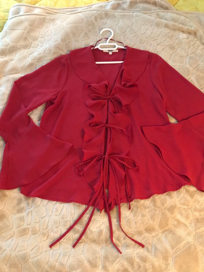 Kırmızı renkli, uzun kollu ve V yakalı kadın bluz, önünde volan detaylarına sahiptir. Yumuşak ve sıcak kumaştan, bol kesimdir, rahat bohem tarzı için uygundur.