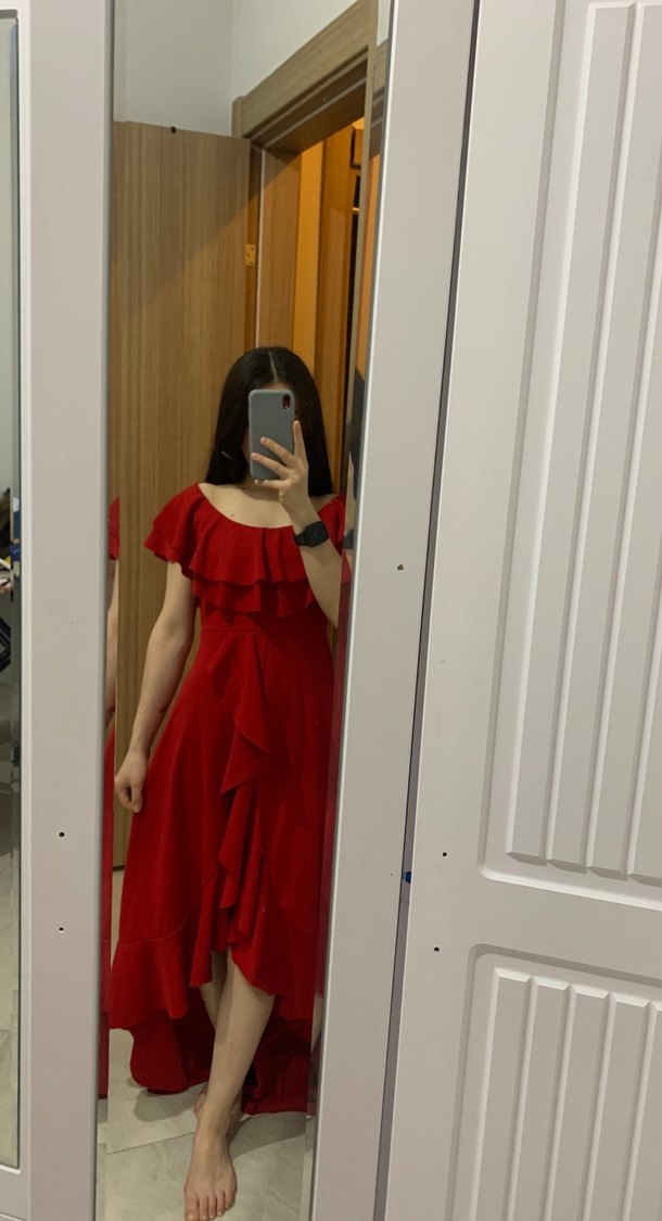 Parlak sentetik kumaştan, volan detaylı ve kolsuz, vücuda oturan kırmızı midi elbise. Romantik akşamlar, mezuniyet geceleri, balolar için uygun.