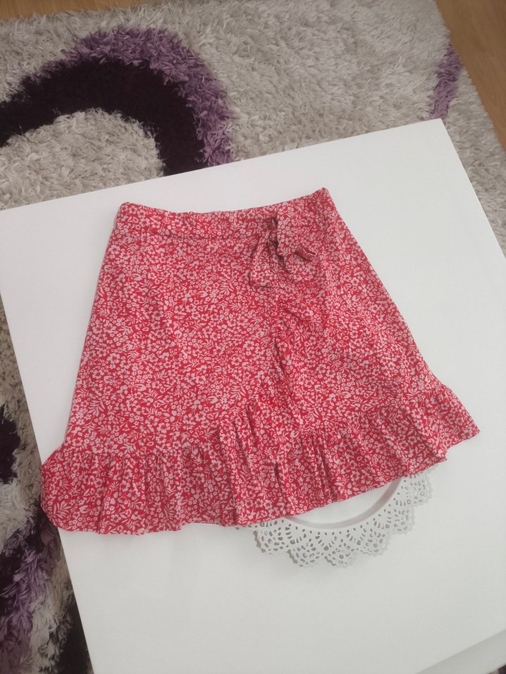 bol kesim kısa mini etek. Kırmızı renkli, renkli batik deseni ve volan detayına sahip. Bohem, rahat tarz için uygundur.