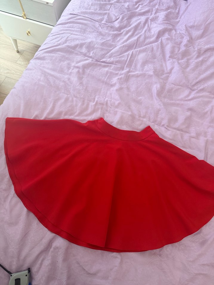 Kırmızı, volan detaylı, vücuda oturan mini etek. Düz ve renkli tasarımı, partiler için uygun minimal pop kültür stilinde.