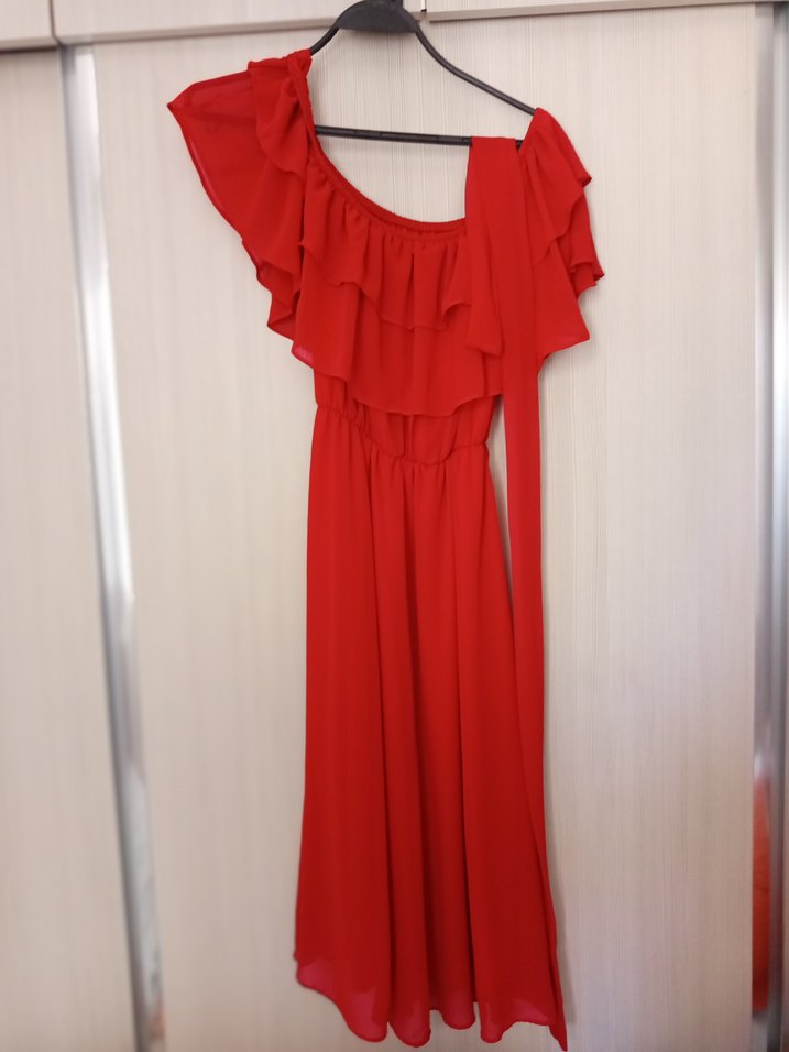 Kırmızı renkte, volan detaylı, askısız ve kolsuz uzun, bol kesim bohem elbisedir. Romantik akşamlar için uygundur.