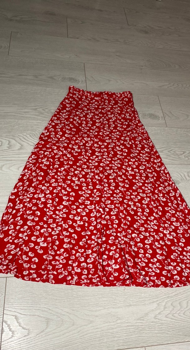Kırmızı renkte, sentetik kumaştan yapılmış, volan detaylı ve bol kesim midi etek. Koyu tonlu batik desenlidir, bohem ve retro tarzlara uygundur.