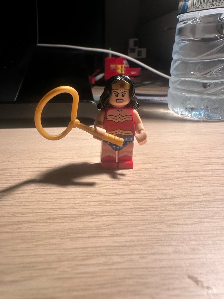 Kırmızı renkli Wonder Woman aksiyon figürü, sarı iple birlikte gelir ve karakterin güçlü ifadesini yansıtır. ♀️