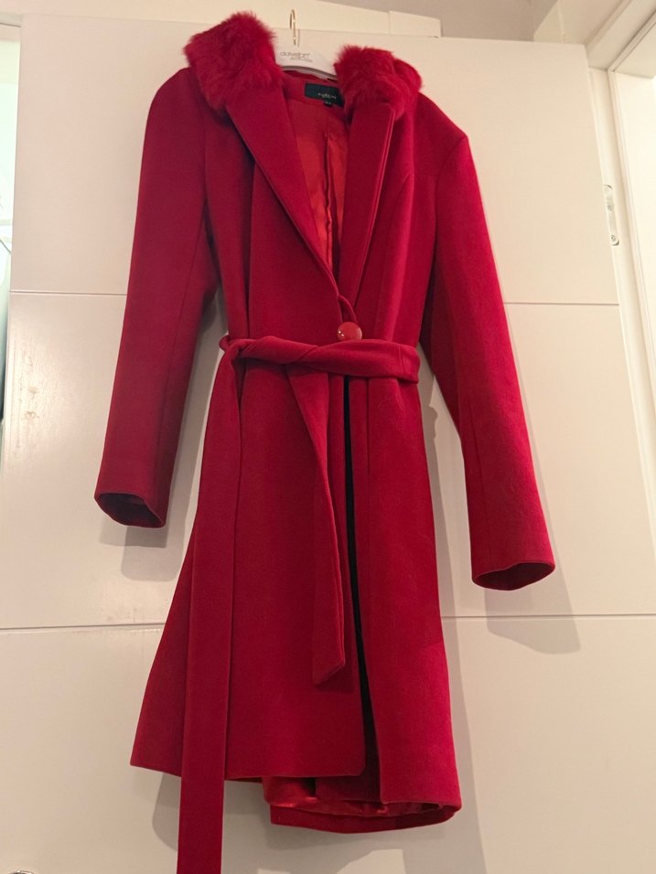 Kırmızı renkte, yumuşak tüylü yakaya ve kemere sahip uzun kollu kaban. Düğmeli kapama ile tamamlanmıştır.