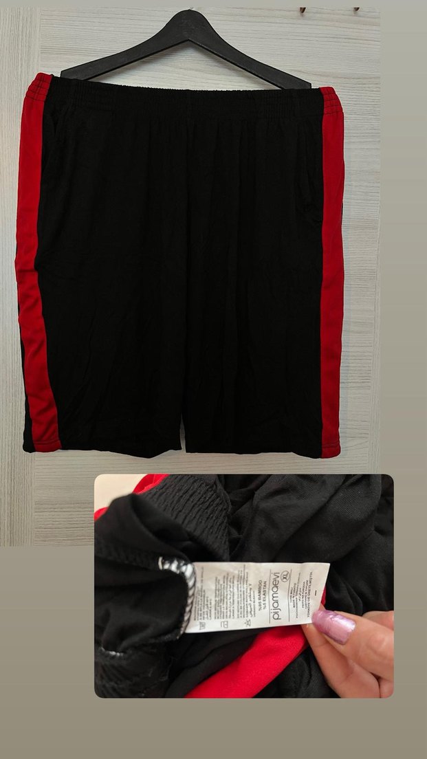 Fermuarlı cepleri ve kırmızı yan şeritleri olan, rahat kesim siyah erkek spor şortu. Sentetik, yumuşak kumaştan üretilmiştir.