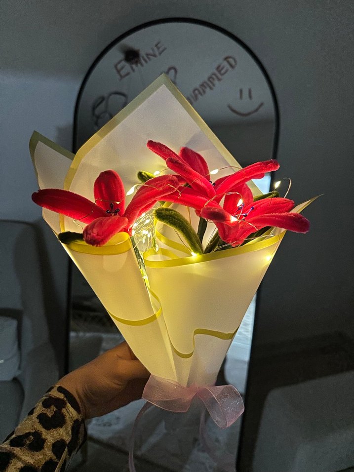 Kırmızı yapay çiçekler, yumuşak ışıklar ve şeffaf sarı sargıyla renkli bir hediye buketi. İnce ışıklar ve pembe kurdele içerir. El yapımı solmaz dökülmez fiyatları farklıdır sorunuz