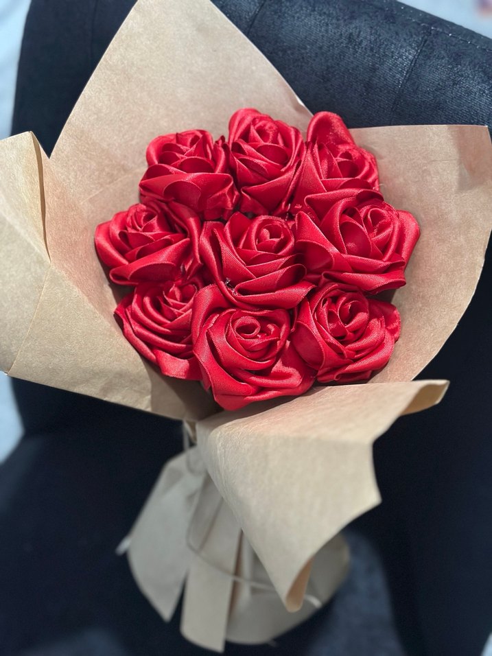 Canlı kırmızı yapay güllerden oluşan buket, doğal renkli kağıtla sarılmış. Güller pürüzsüz ve saten dokuda, yuvarlak şekilde düzenlenmiş.