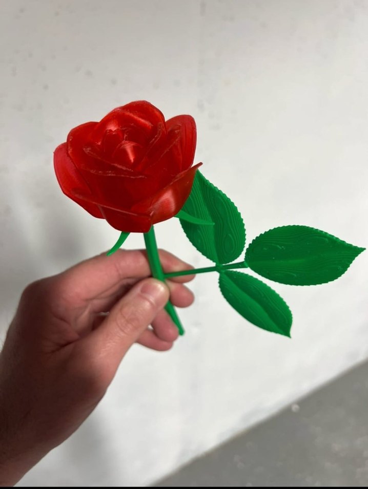 Yeşil yapraklı, kırmızı renkli yapay gül figürüdür. 3d baski