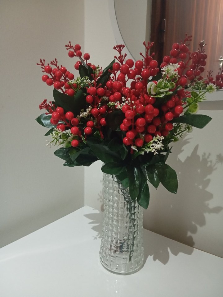Kırmızı yapay meyveler ve yeşil yapraklarla süslenmiş, dokulu cam vazoda renkli dekoratif çiçek aranjmanı.