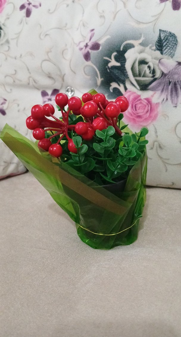 Canlı kırmızı meyveler ve yeşil yapraklarla süslenmiş yapay dekoratif bitki, yeşil şeffaf kağıda sarılıdır. Ev dekorasyonuna renk katar.