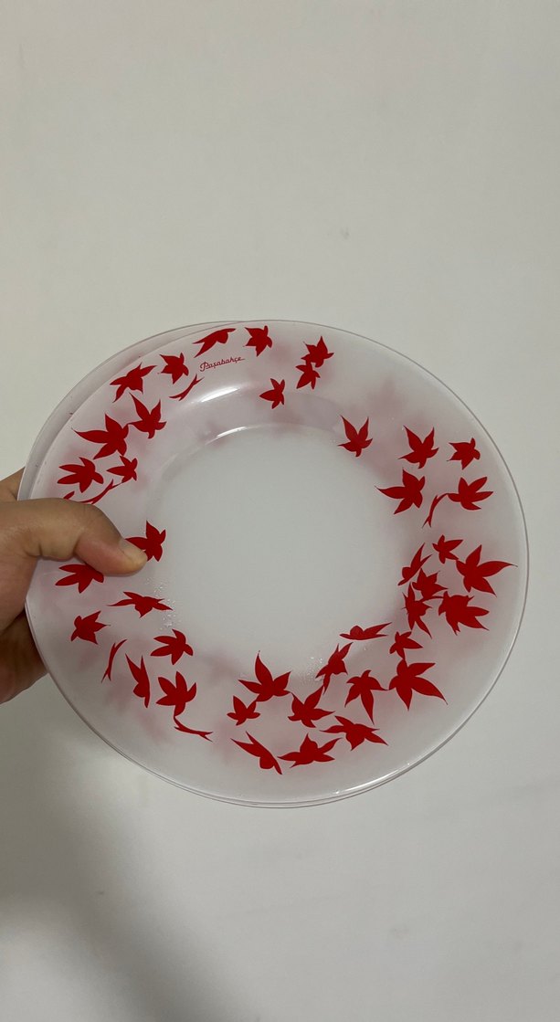 Kenarında kırmızı yaprak desenleri bulunan cam tabak, klasik tarzda sofralar için uygundur. ️