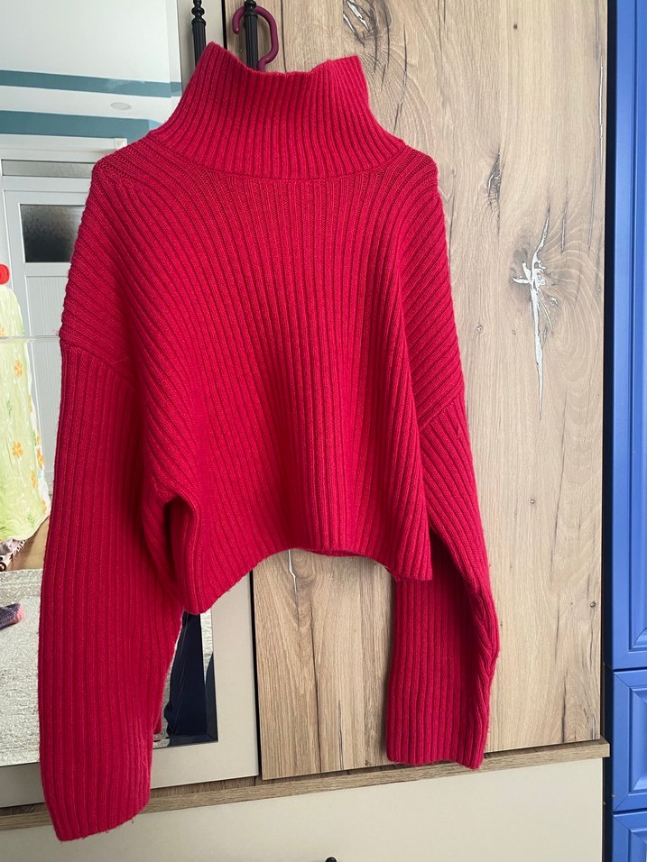 Kırmızı örgü kadın kazak, yarım balıkçı yaka ve uzun kollu, rahat kesim ve normal boyda. Günlük kullanıma uygun, rengarenk ve sade dokuda.