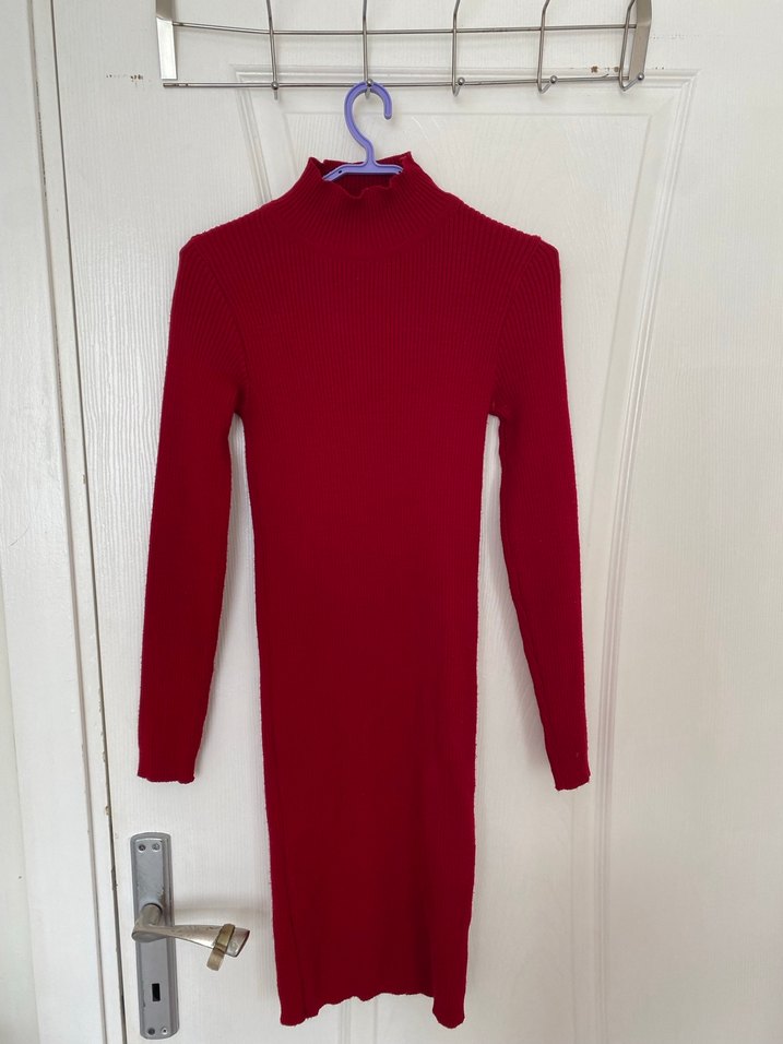 Kırmızı renkte, yarım balıkçı yaka ve uzun kollu, triko dokulu, midi boy, vücuda oturan elbisedir. Günlük kullanıma uygundur.