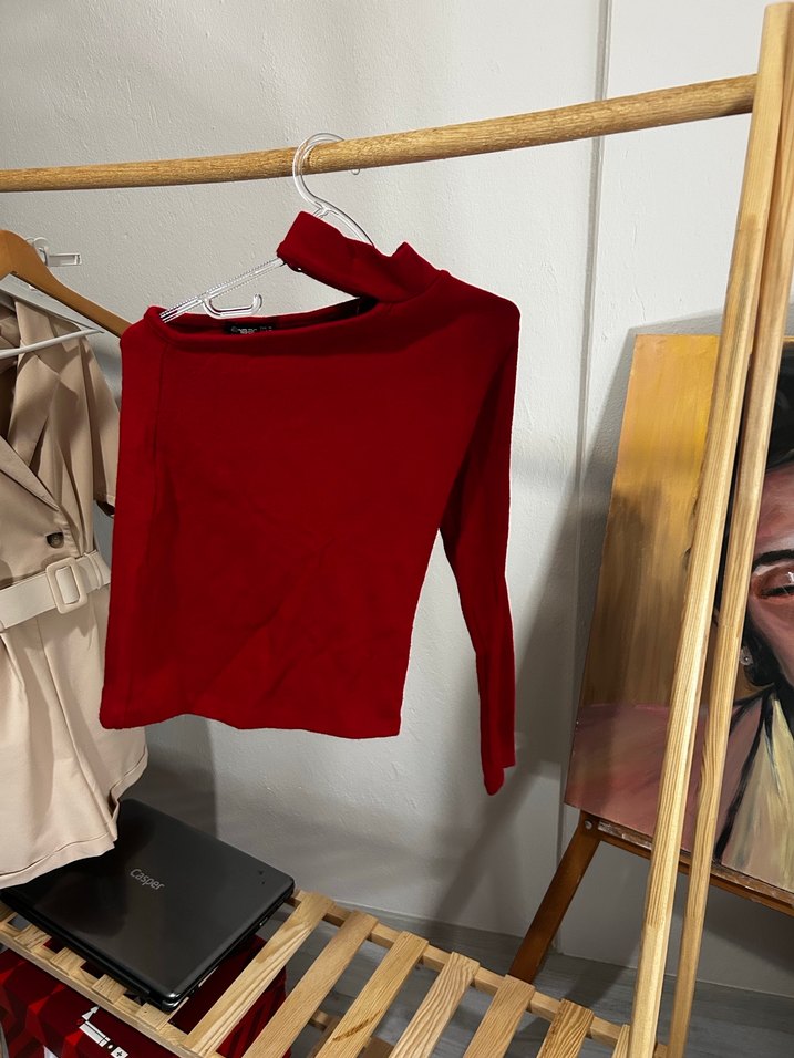 Kırmızı süet kumaştan, uzun kollu ve yarım boğazlı, vücuda oturan kadın kazak. Minimalist, sokak stilinde, günlük kullanıma uygun midi boyda.