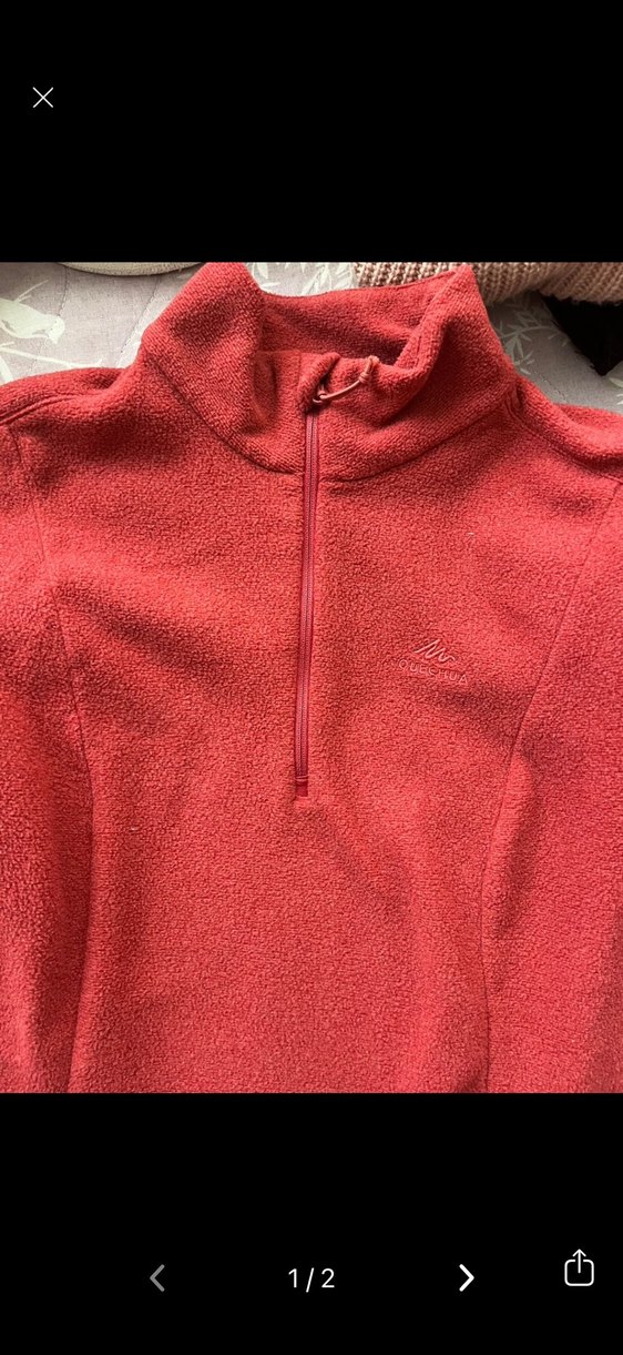 Yarım fermuarlı, yüksek yakalı kırmızı kadın sweatshirtü. Uzun kollu, vücuda oturan ve normal uzunlukta, yumuşak ve sıcak kumaşlı.