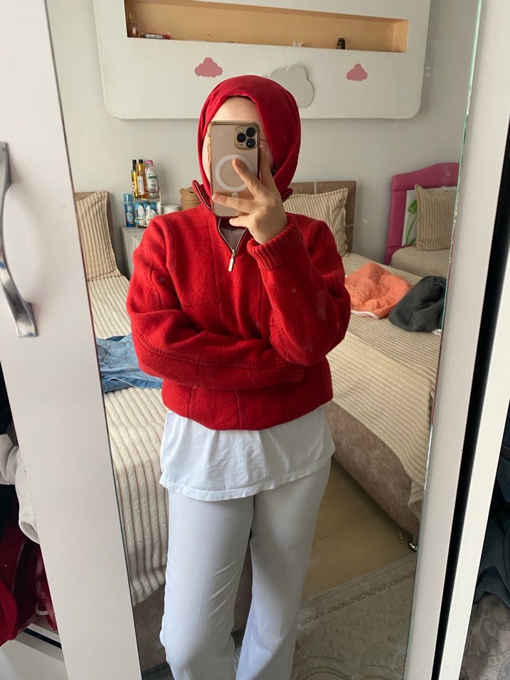 Yarım fermuarlı, yüksek yakalı kırmızı örgü kazak, rahat kesimi ve midi boyu ile günlük sokak stiline uygundur. Yumuşak ve sıcak dokusu ile konfor sağlar.