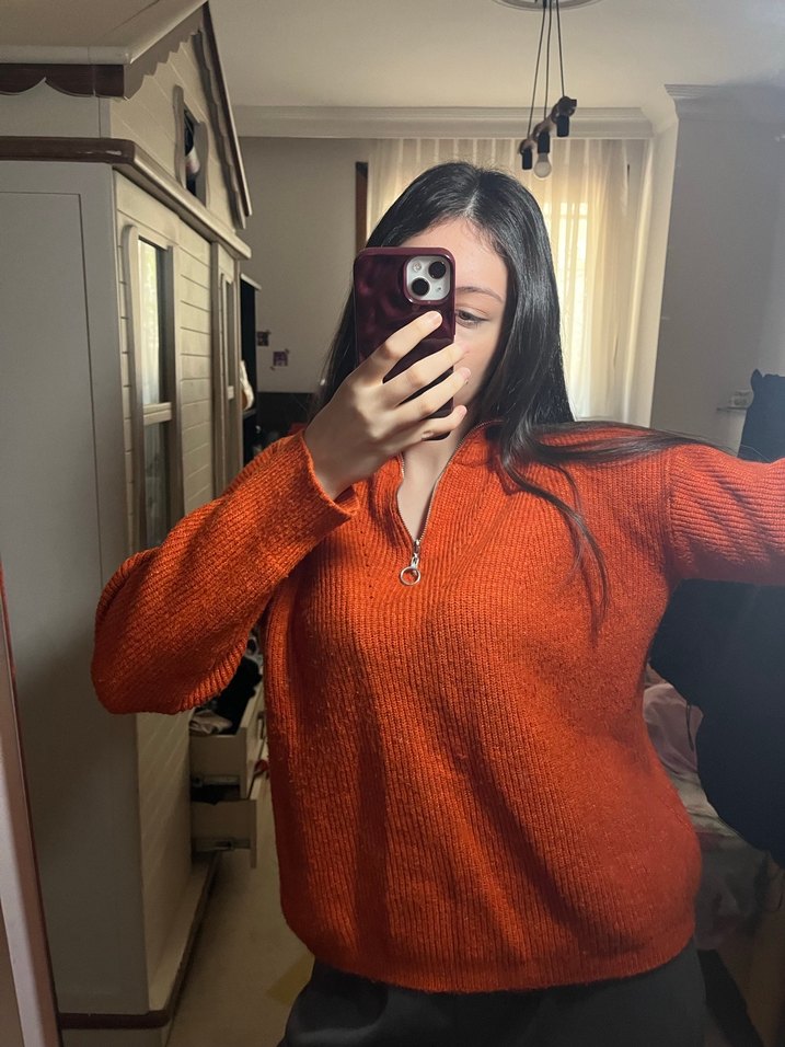 Kırmızı, parlak görünümlü, yarım fermuarlı yüksek yakalı triko kazak. Bol kesim, uzun kollu ve midi boyda, günlük kullanıma uygun.