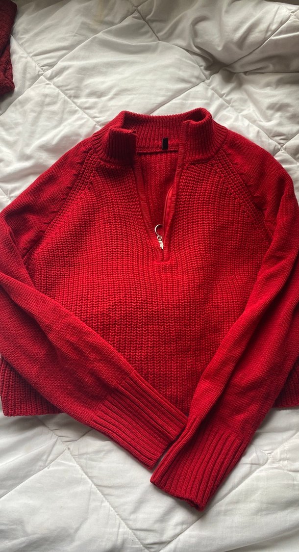 Kırmızı, yarım fermuarlı, yüksek yakalı, uzun kollu, triko dokuma ve parlak görünümlü bu kazak, rahat ve şık bir günlük sokak stili sunar.