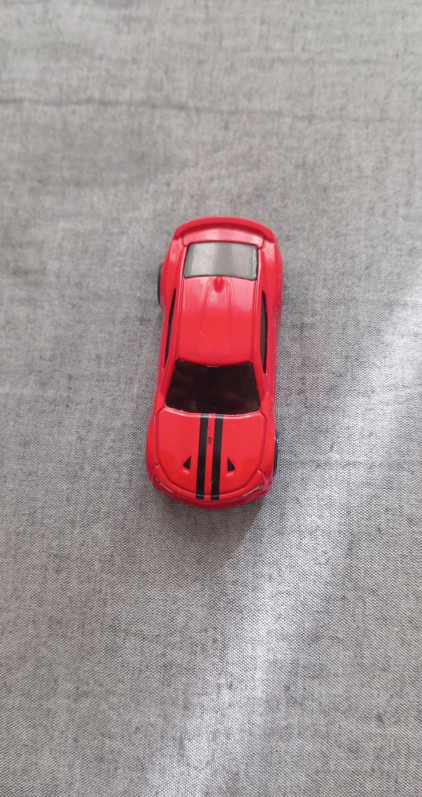 Siyah yarış çizgili kırmızı oyuncak araba, renkli ve canlı görünüme sahip. Oyun zamanı için ideal.