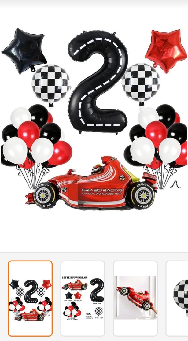 Bu renkli parti balon seti, büyük siyah 2 rakam balonu, kareli bayrak balonları, kırmızı ve siyah yıldız balonları ile GRABORACING yazılı kırmızı yarış arabası balonundan oluşur.