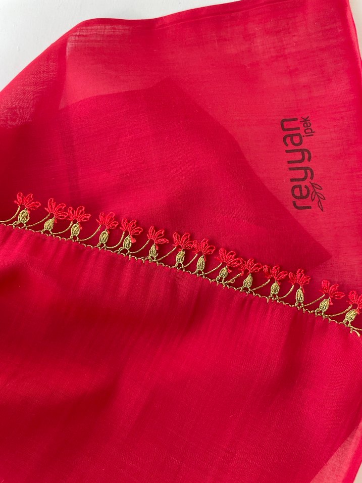 Kırmızı renkli, fırfırlı detaylara sahip kadın fular. Yumuşak ve hafif tekstil kumaş, Reyyan İpek markalı.